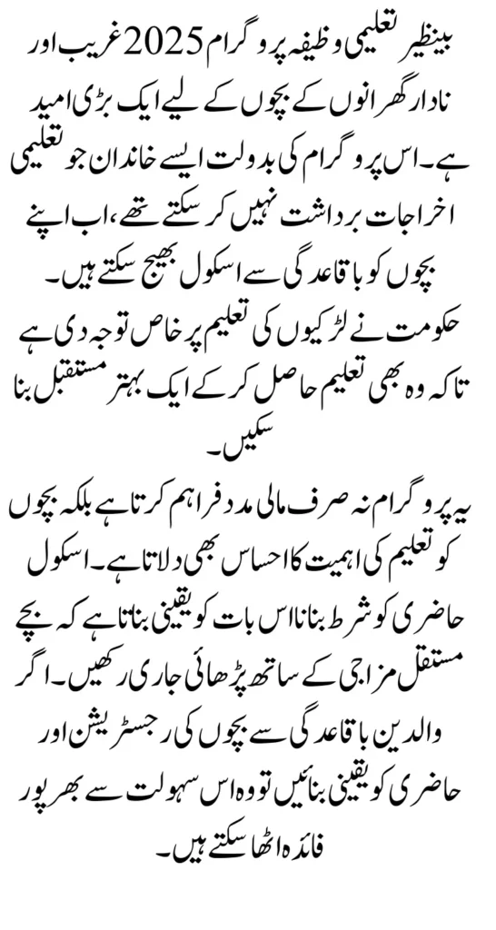 The Benazir Taleemi Wazaif Program 2025 is a landmark initiative that continues to bring hope to thousands of families across Pakistan. By offering quarterly stipends ranging from Rs. 2,500 to Rs. 5,000, along with special incentives for girls, the program is making a real difference in reducing dropout rates and empowering disadvantaged children.