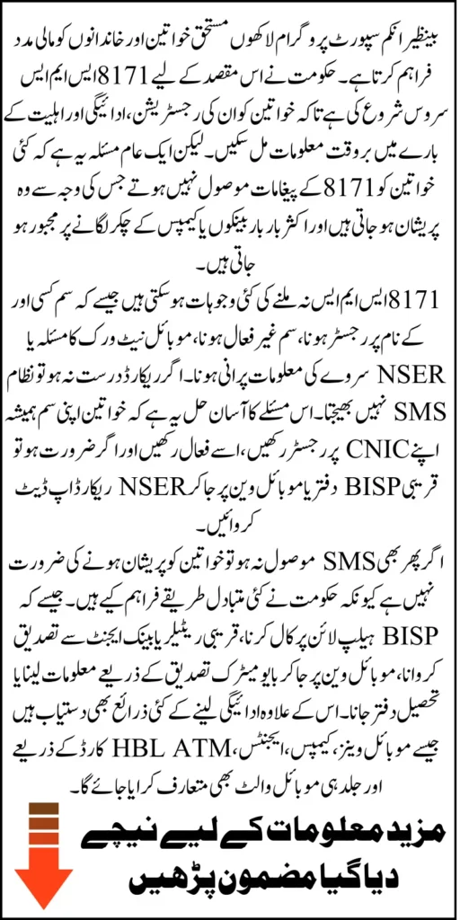 If the problem continues, keep a record of all visits and contact the BISP office regularly until it is resolved. The government has created multiple ways to confirm payments, so families should not worry if they miss the SMS.