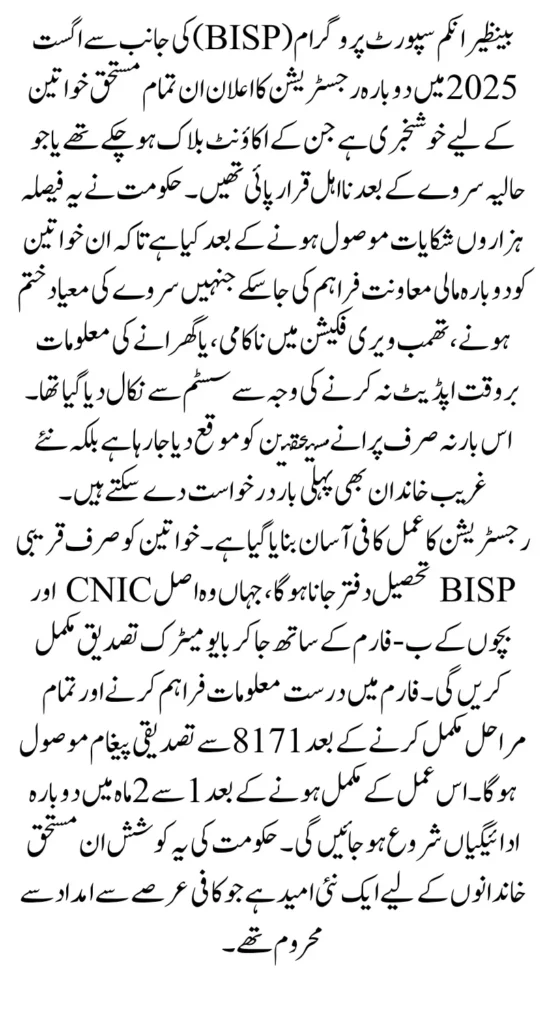 The decision to reopen BISP 8171 re-registration in September 2025 is a great opportunity for thousands of poor women to return to the financial support system they had once relied on. If you or someone you know was declared ineligible or had their account blocked due to survey issues or verification problems, this is the time to act.