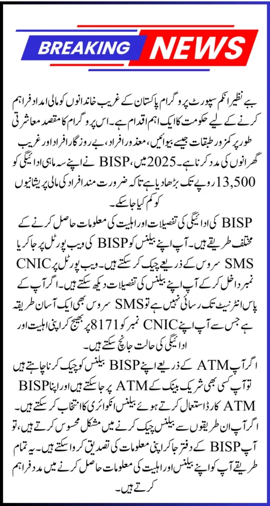 Check BISP 8171 Balance Online The Benazir Income Support Program is an essential initiative by the government of Pakistan aimed at providing financial assistance to low-income families. This program targets the most vulnerable sectors of society, including widows, disabled individuals, unemployed persons, and those from economically disadvantaged households. In 2025, BISP has increased its quarterly payment to 13500 to help alleviate the financial burden on those in need.