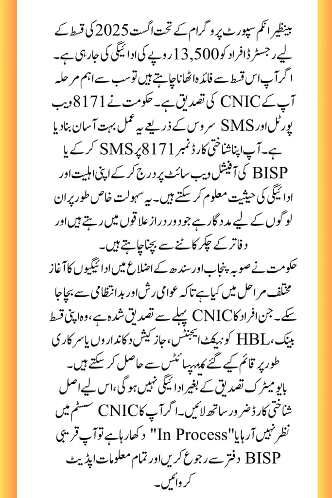 Since its launch in 2008, BISP has expanded its operations across Pakistan, making it easier for the most deserving to access financial aid. The digital systems introduced through the 8171 SMS code and the BISP 8171 web portal have simplified the process, reducing the need for repeated office visits and minimizing errors. In this detailed guide, we explain the latest method to check your CNIC status, the registration process, eligibility criteria, and how payments are being disbursed during September 2025.