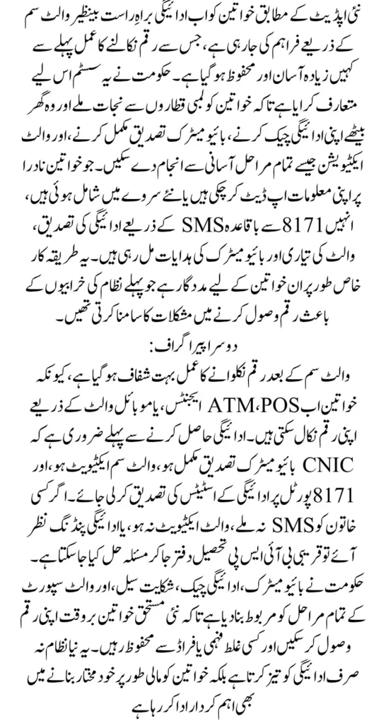 For women whose CNICs are flagged or blocked, NADRA offices provide re-verification services. These updates are necessary before payments can be released or the Wallet SIM can be activated. Once corrected, payment status usually updates on the 8171 portal within the same week.