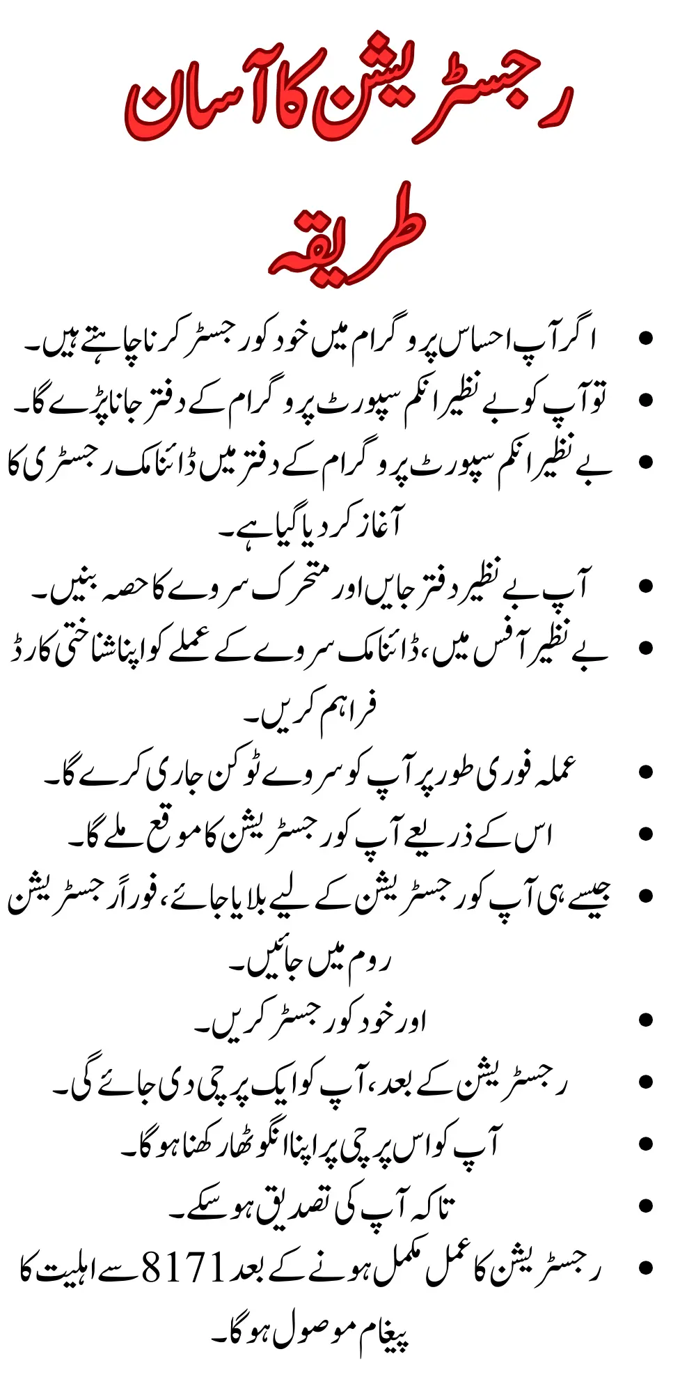 Take the registration form and enter all your details After a few days, a registered SIM confirmation message will be sent to your ID card that you are eligible for the Ehsaas program and can collect your assistance amount from any nearby Benazir and HBL branch office.