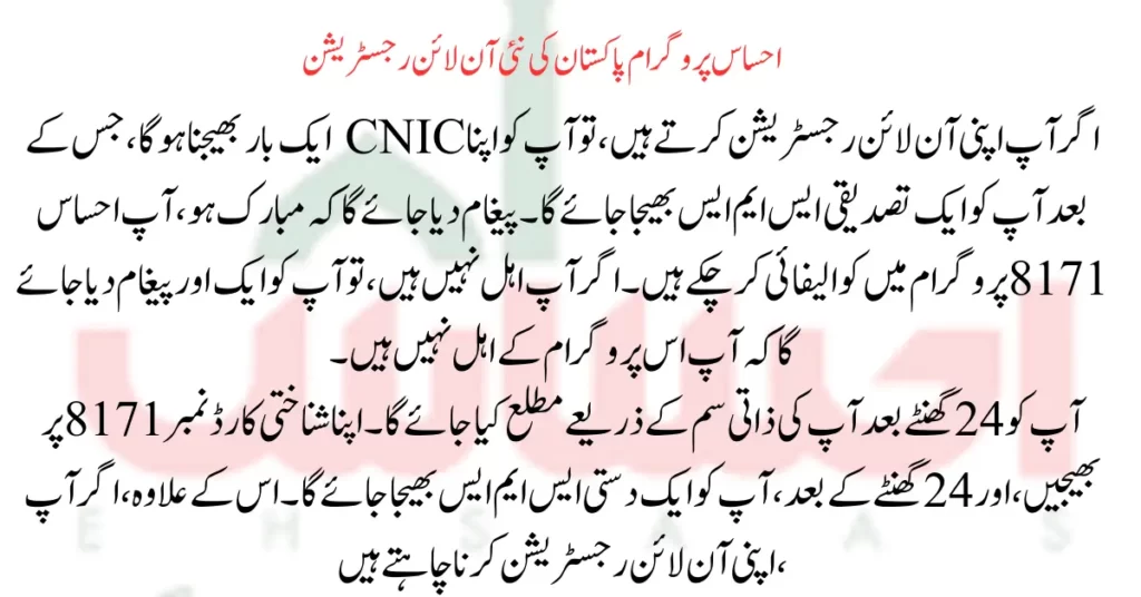 If you register online, you must send your CNIC together once, after which a confirmation SMS will be sent to you. A message will be sent saying that congratulations, you have been qualified for the Ehsaas 8171 program. If you are not eligible, you will be given another message saying that you are not eligible for this program.
