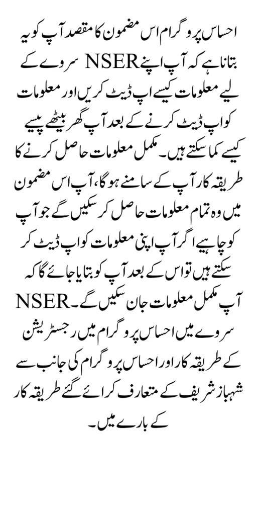 Ehsaas programme The purpose of this article is to tell you how to update information for your NSER survey and how you can earn money at home after updating information. The procedure to get complete information will be in front of you, you will be able to get all that information in this article Which you should if you can update your information After that you will be told that you will be able to know the complete information about the registration procedure in Ehsaas program in NSER survey and a procedure introduced by Shehbaz Sharif on behalf of Ehsaas program.